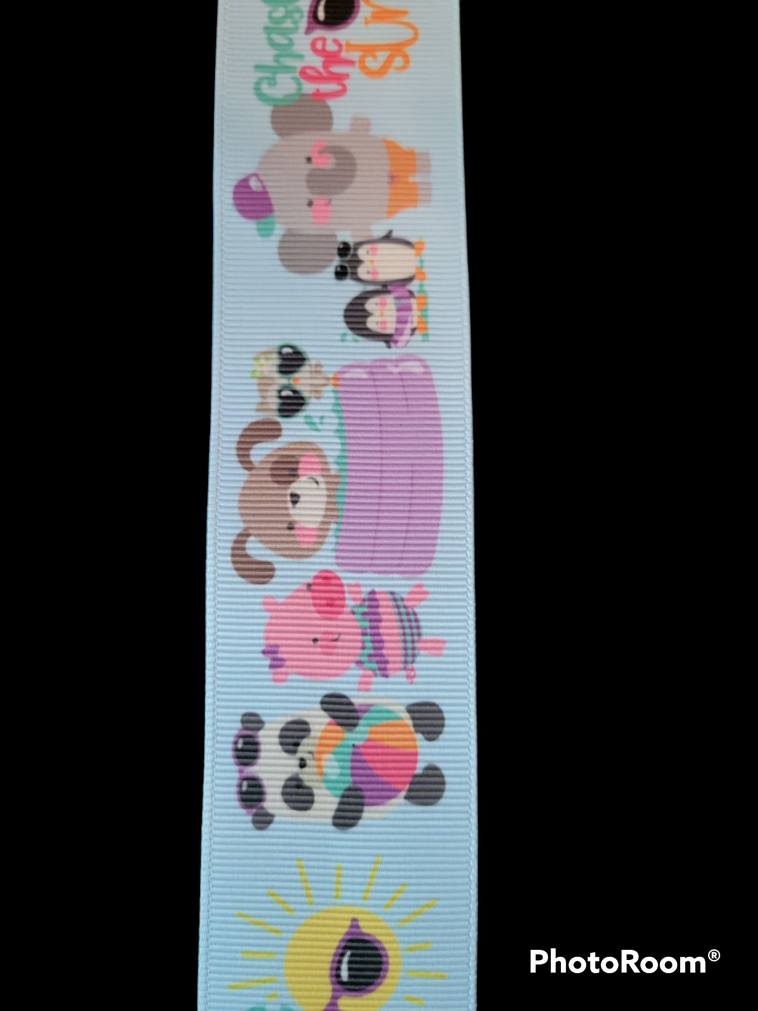 USDR Chase the Sun with animals grosgrain ribbon on a light blue background.