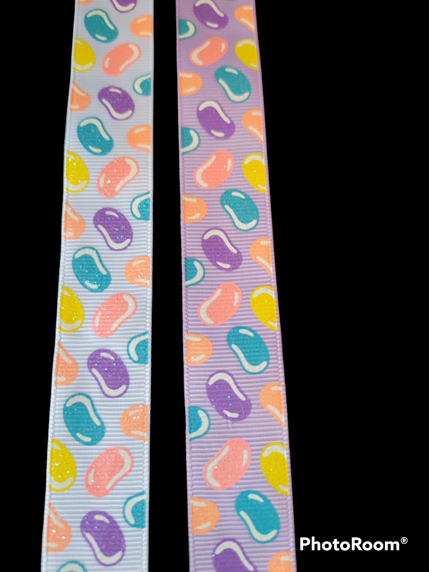USDR lightly glittered jellybean ribbon in 7/8" multicolored jellybeans one with a white background and one with a lavender background.