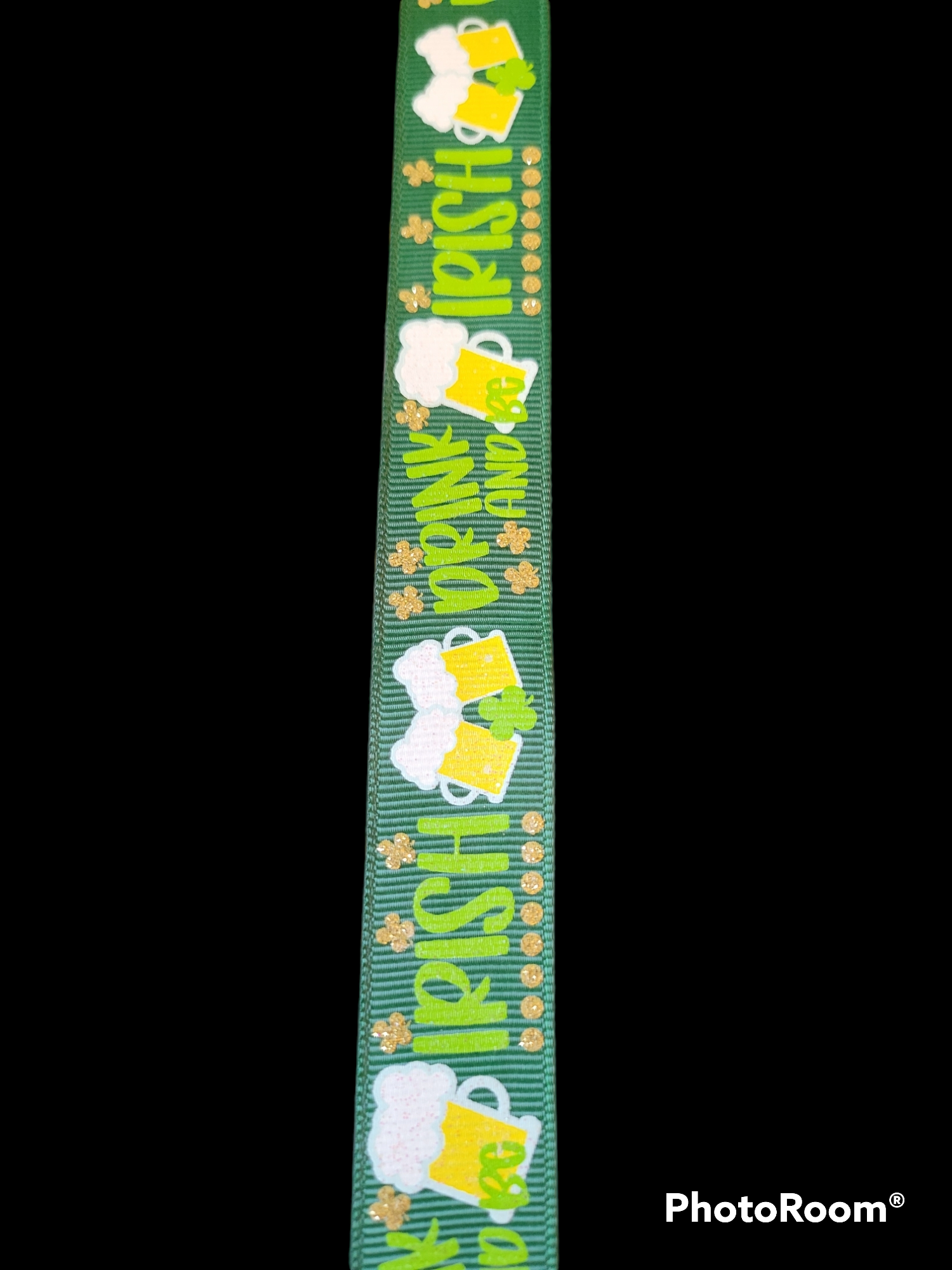 USDR Glittered Drink and Be Irish grosgrain ribbon with a mug of beer on a green background.