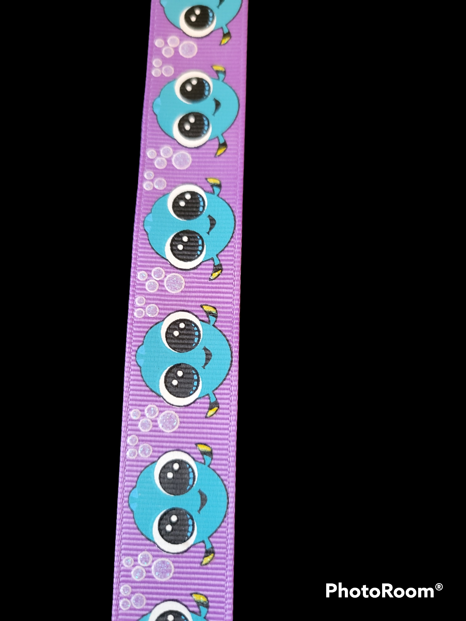 USDR Glittered Big Eyed Fish grosgrain ribbon in 7/8" one is light blue with the wording "I suffer from short-term remembery loss" and the other one with a purple background and no wording.