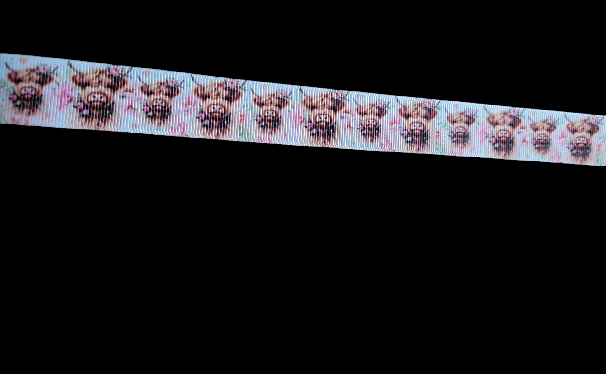 USDR grosgrain ribbon with cows on a white background with pink roses