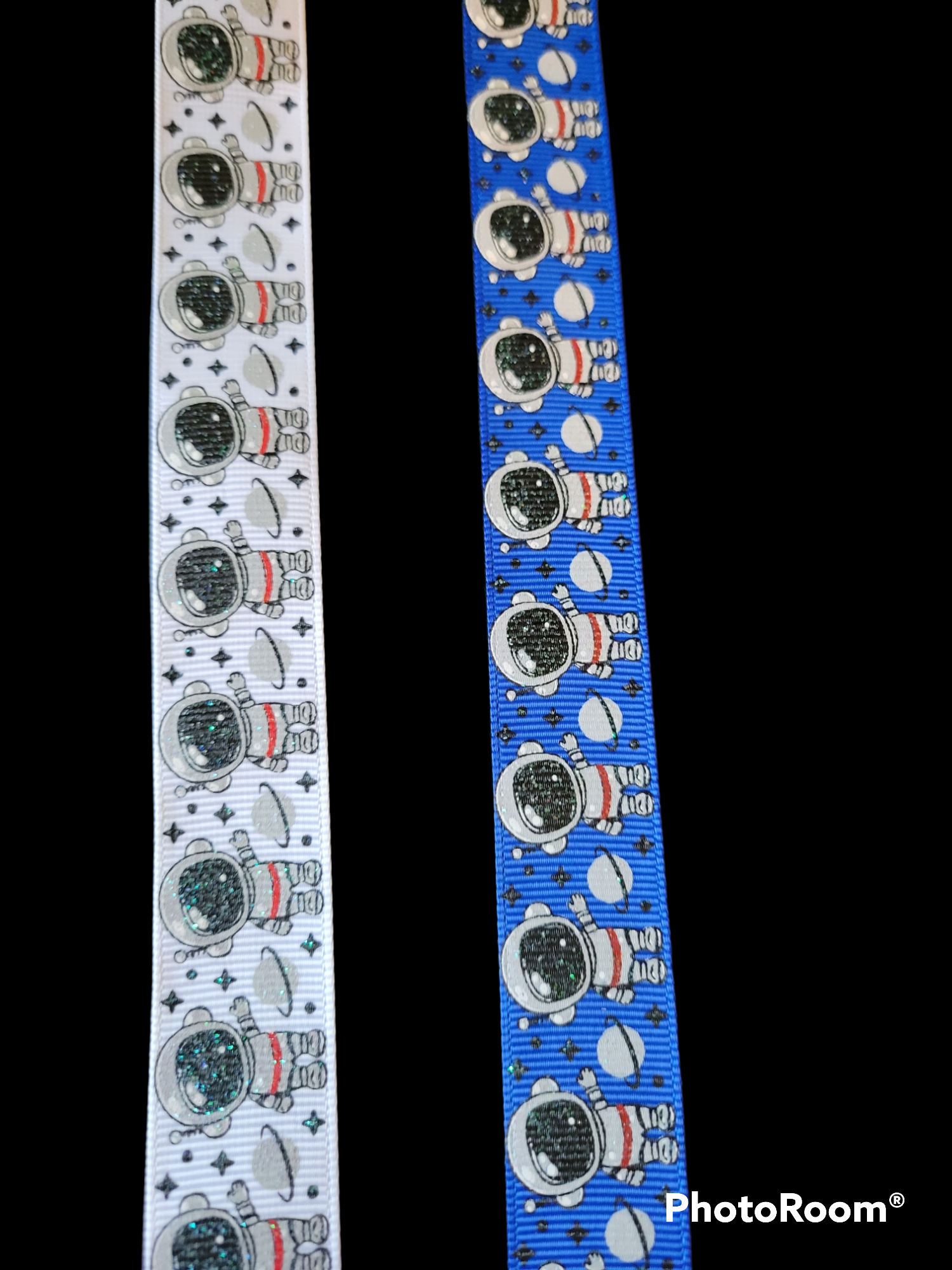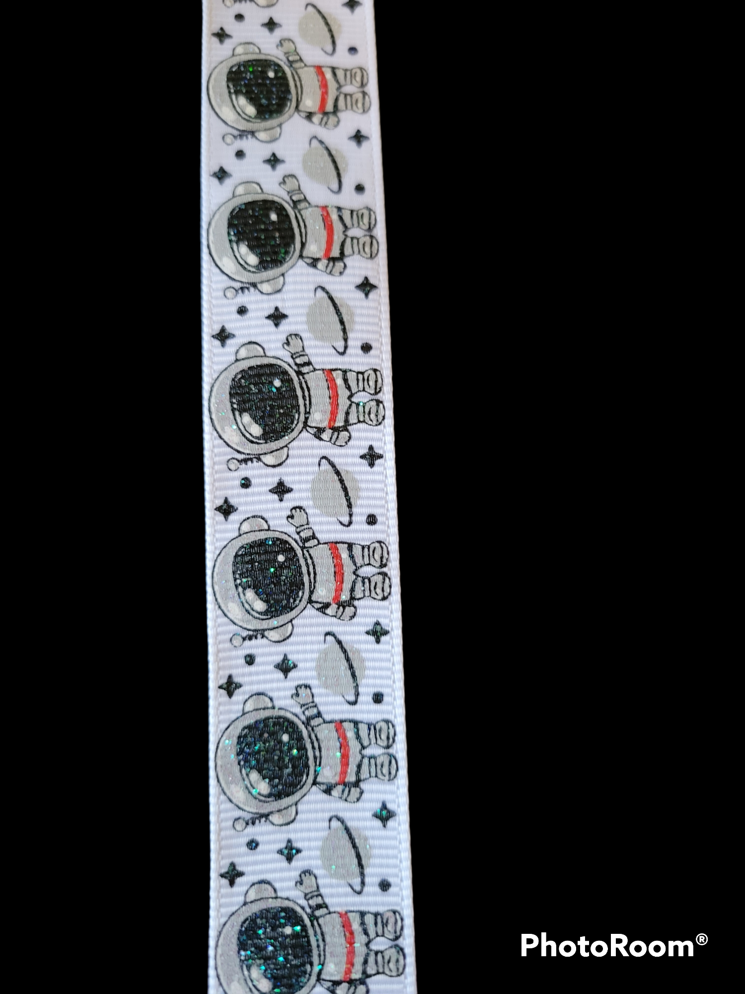 USDR lightly glittered 7/8" grosgrain ribbon with Astronaut and Saturn in gray on a white or background