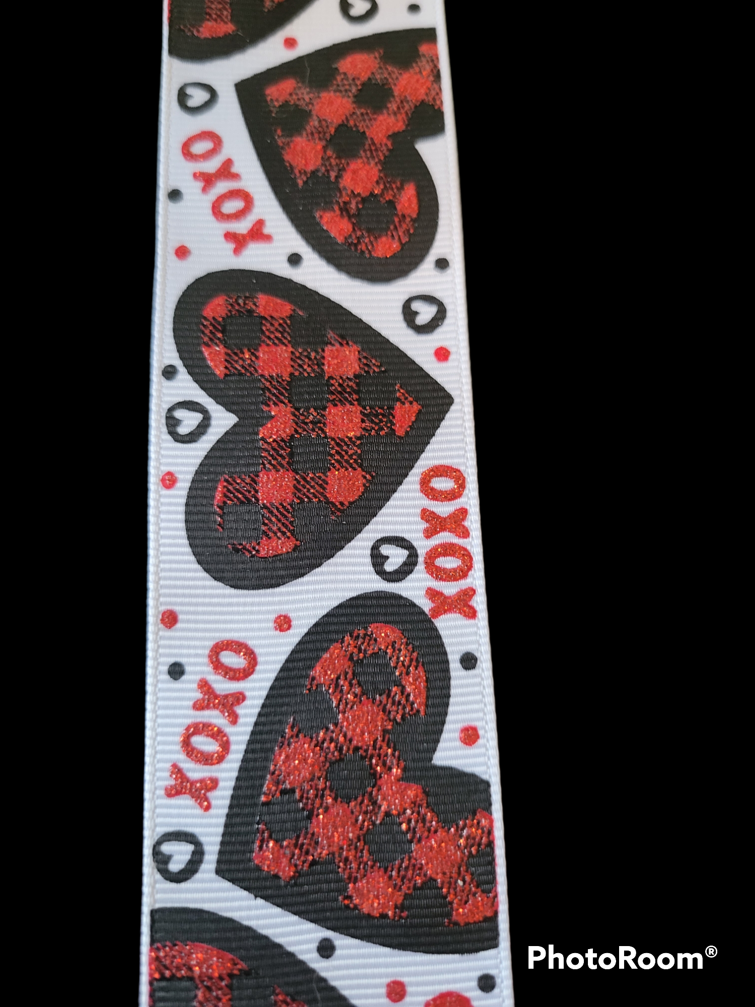 USDR grosgrain ribbon with plaid black and red Heats in glitter with xoxo on a white background and one with the saying I Love You More